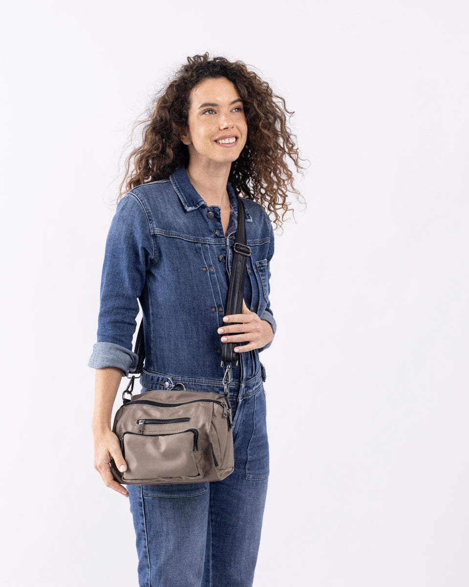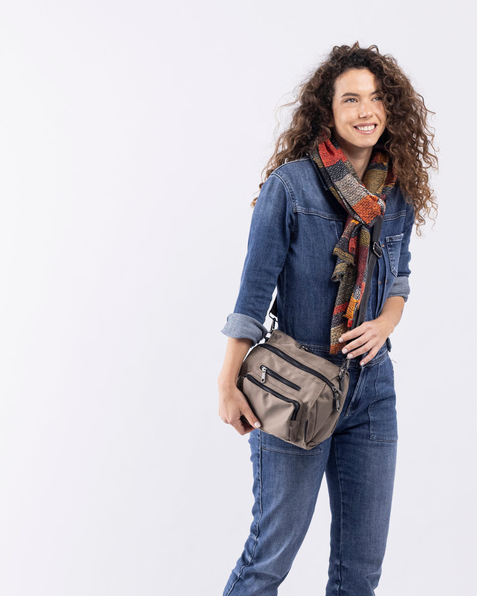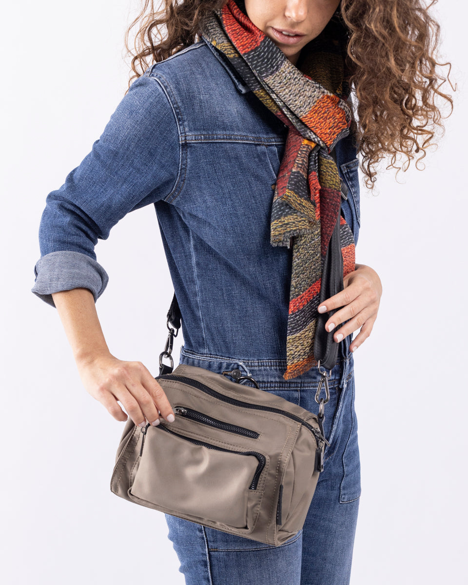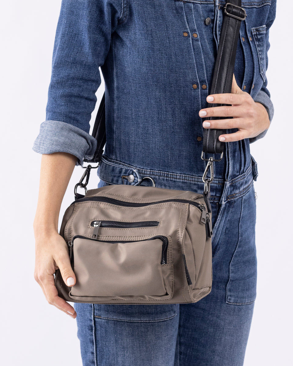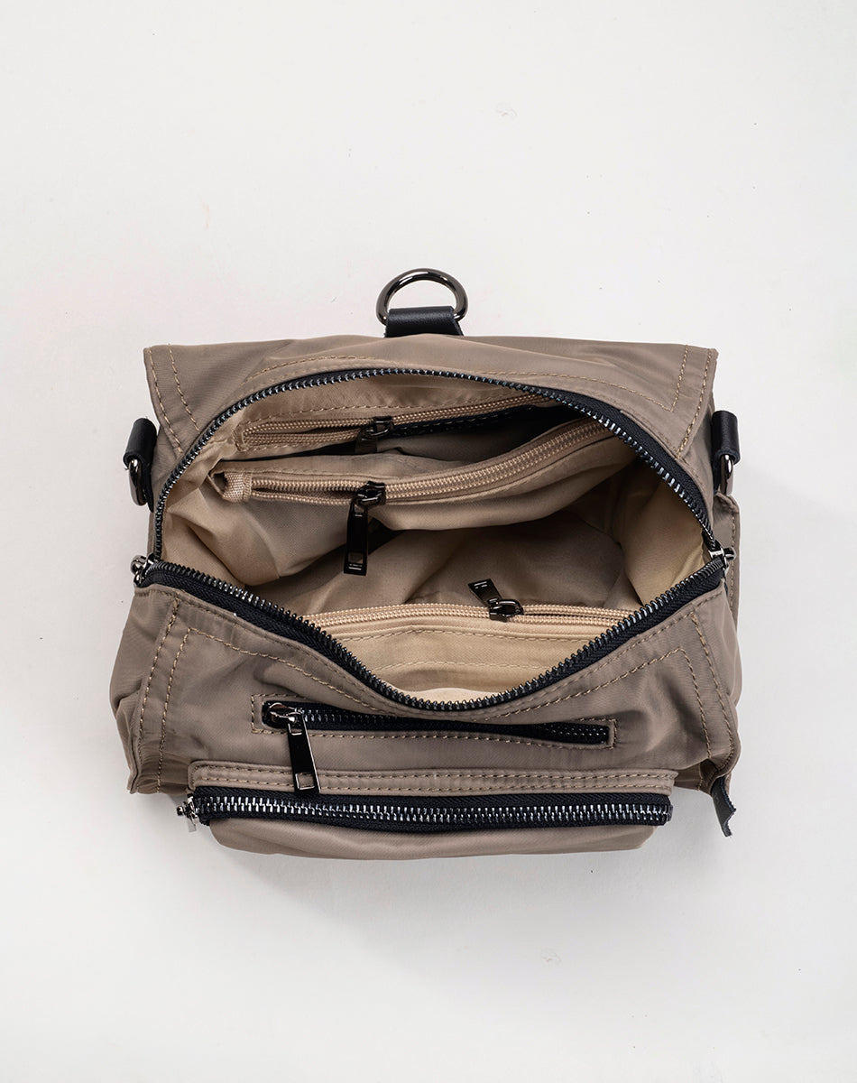 עשוי ניילון איכותי דוחה מים, משולב עם עור נאפה רך. התיק קל משקל ומצויד ברצועה מתכווננת, הניתנת להתאמה באופן נדיב